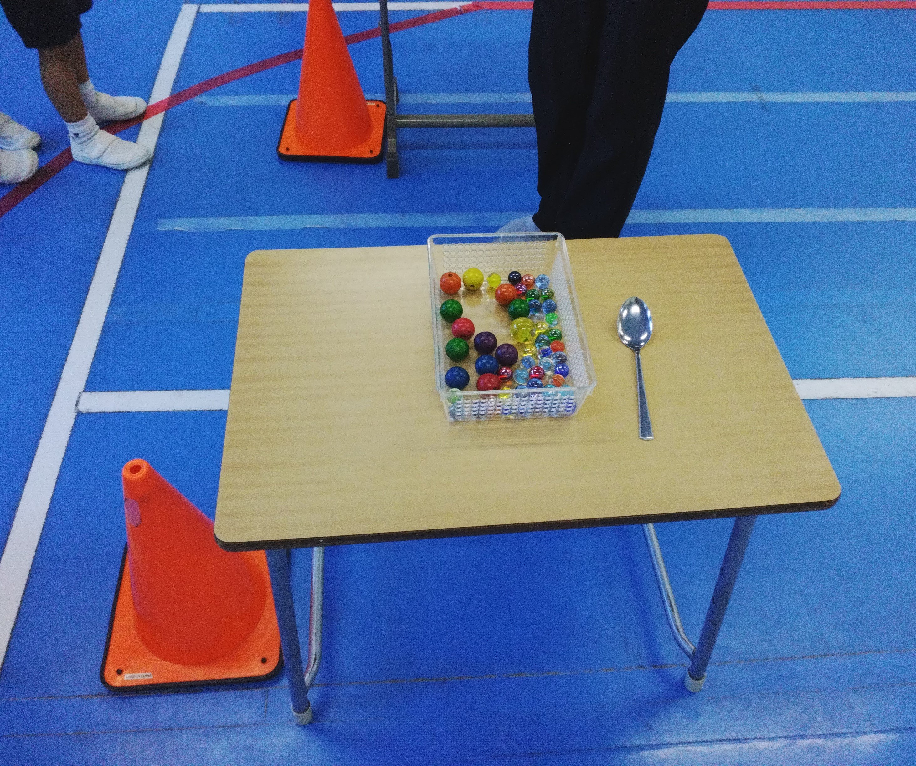 ②戻ってきたらスプーンを初めの机に戻し、一番後ろに並びます。